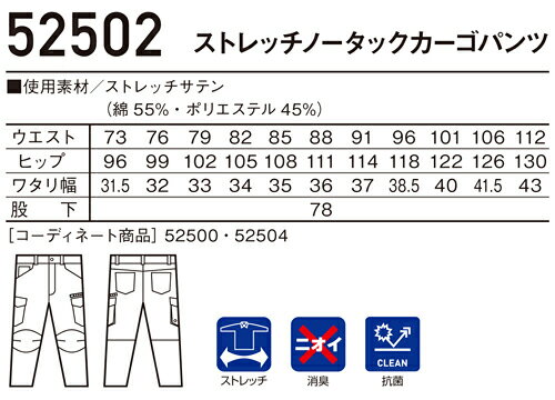 スペック メーカー 自重堂(JICHODO) 品番/シリーズ 52502/Jawin 52500シリーズ シーズン 秋冬物※このシリーズの春夏対応シリーズはコチラ 商品名 ストレッチノータックカーゴパンツ 素材・混率 ストレッチサテン(綿55%・ポリエステル45%) 機能 ストレッチ、消臭、抗菌 仕様 ※この製品は、従来のJawin製品より、シルエットが少しタイトになっています。