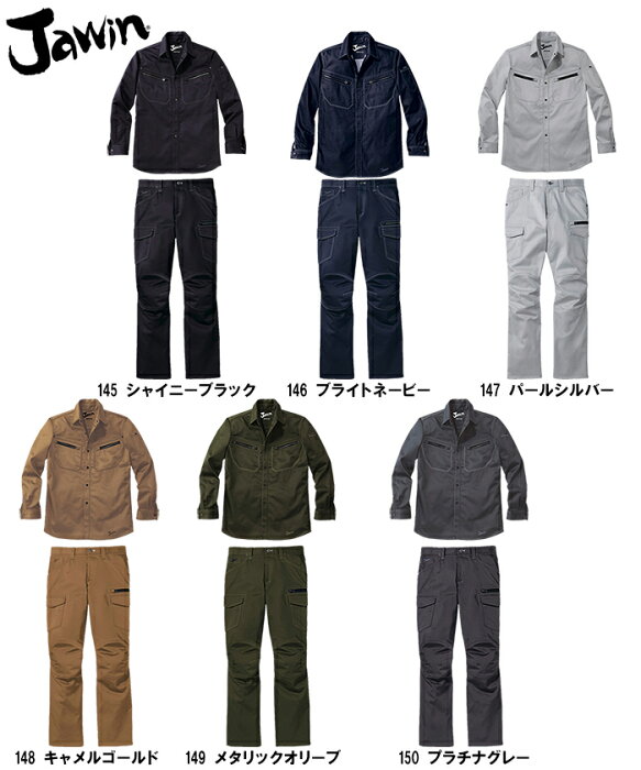 カラー 145:シャイニーブラック 146:ブライトネービー 147:パールシルバー 148:キャメルゴールド 149:メタリックオリーブ 150:プラチナグレー サイズ ストレッチ長袖シャツ:S〜5L ストレッチノータックカーゴパンツ:73cm〜112cm ※EL/91cm〜112cm以降は割り高になります。