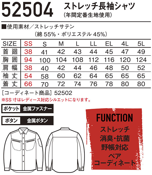 スペック メーカー 自重堂(JICHODO) 品番/シリーズ 52504 52502 SET/Jawin 52500シリーズ シーズン 秋冬物※このシリーズの春夏対応シリーズはコチラ 商品名 ストレッチ長袖シャツ&ストレッチノータックカーゴパンツセット(上下同色) 素材・混率 ストレッチサテン(綿55%・ポリエステル45%) 機能 ストレッチ、消臭、抗菌、野帳対応(長袖シャツ) 仕様 ※この製品は、従来のJawin製品より、シルエットが少しタイトになっています。